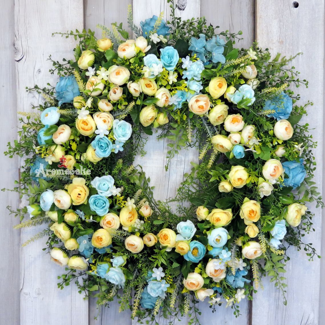 This wreath could be a sweet addition to your Spring/Summer Décor. Constructed as a 14 grapevine wreath features yellow and teal assorted silk roses and ranunculuses, a lot of spring greenery like a fern, maidenhair, and more, and accented with yellow lavender sprays.
