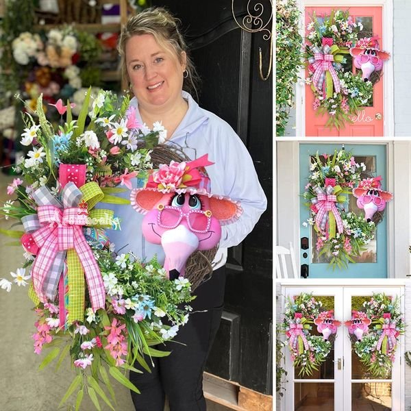 This Flamingo wreath is crafted on a grape wreath.A wonderful metallic summer flamingo logo is the focal point of this design. Perfect for your patio, home, and of course your front door.Adorned with beautiful grasses, flowers, bamboo leaves and all decorations.