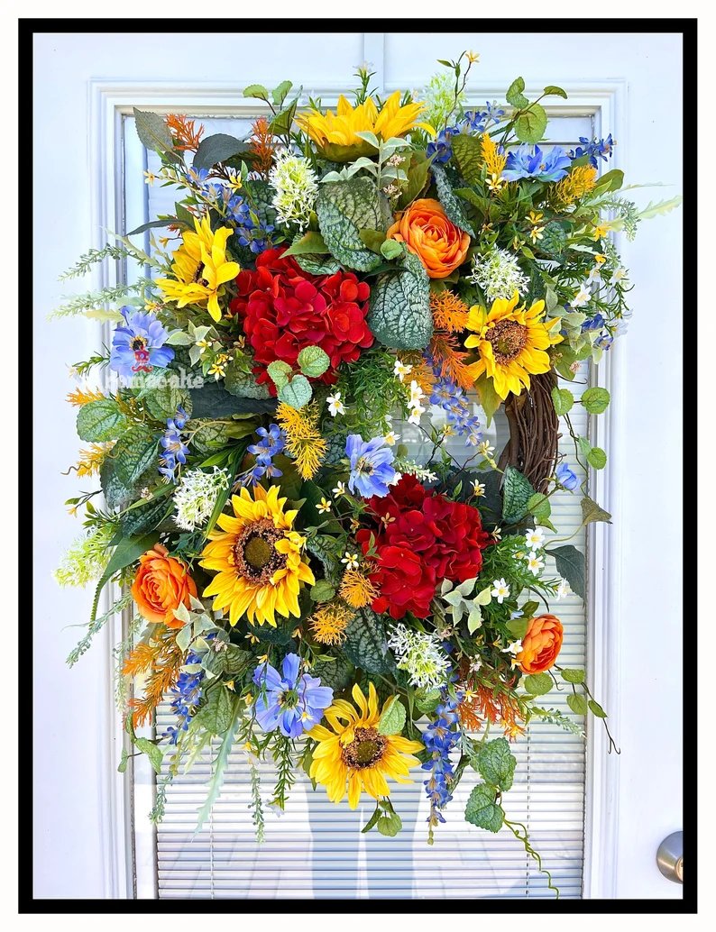 🌷🌷This is a beautifully elegant tuscan summer wreath that is sure to be an eye catcher. It features beautiful yellow sunflowers, dark orange hydrangeas, tangerine orange ranunculus, vibrant blue vinca vine and cosmos, white blossom flowers and thistle, spikes of grass with beautiful greenery. Guaranteed to add some life to your front door.