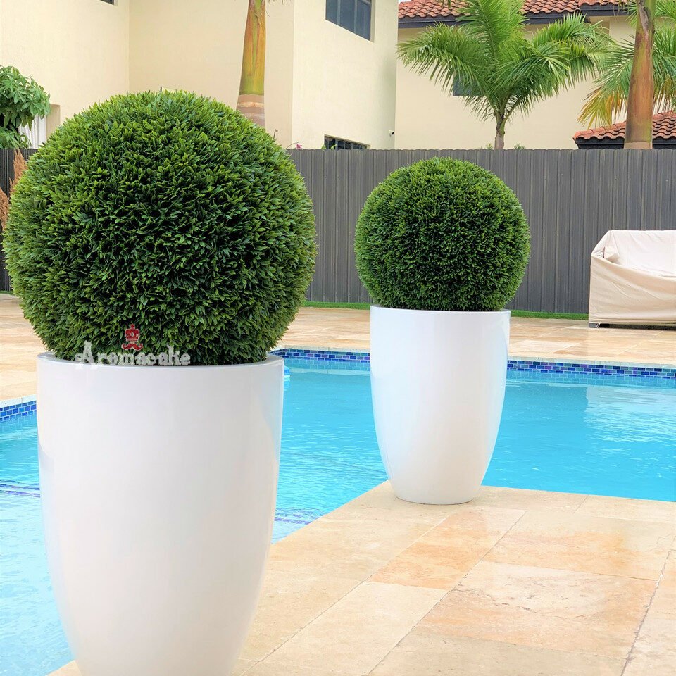 Our topiary collection features the best ultra violet rated artificial topiaries available in the market. It is paired with beautiful fiberglass Ben planter to ensure longevity and resistance to the elements. Guaranteed not to fade or loose their bright green color. Ball topiary is a plant style originally made popular in formal gardens, but nowadays, they can be used to add a touch of elegance – or whimsy – to any decorating style. Use one alone to fill in a corner, or use a pair to flank an entryway or fireplace.