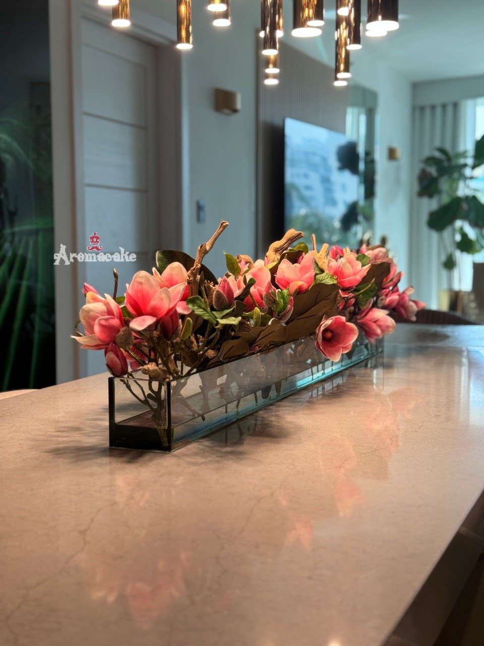 Casa Moderna Glass Planter with Bright Pink Magnolias and Driftwood