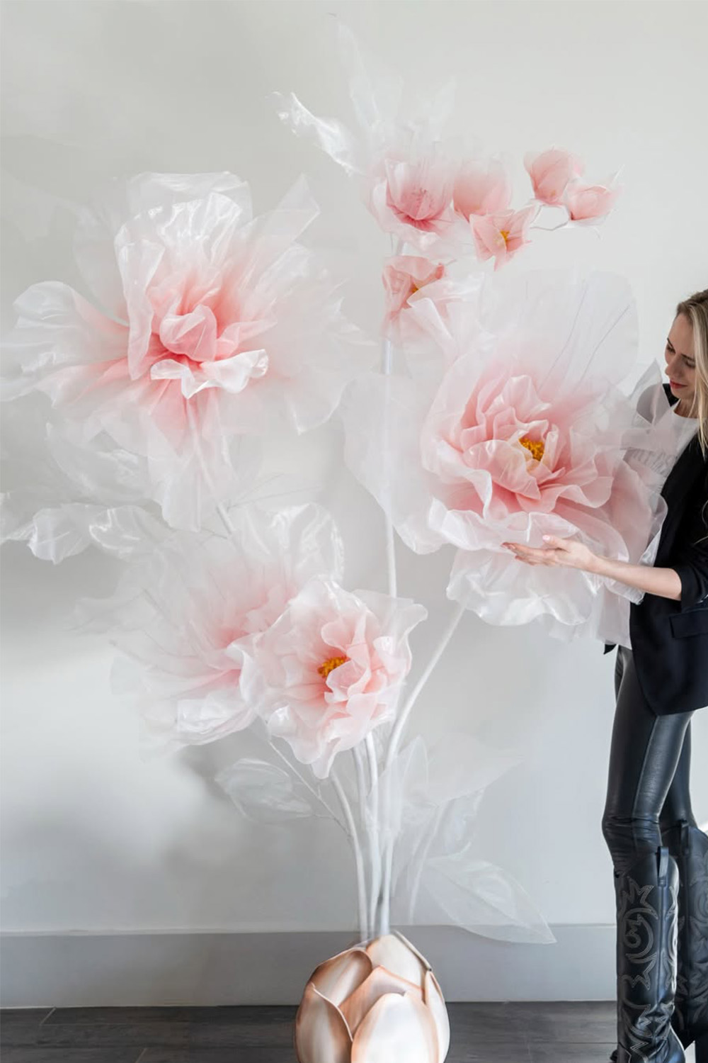 Handcrafted Detail: Each petal is hand-cut, embossed and assembled by experienced craftsmen to restore the natural fluffy texture. Durable & Fade-resistant: Anti-fading paper and moisture-resistant treatment are used, and the colors remain bright after long-term display. Sturdy Metal Stem: Built-in adjustable metal rod and weighted base, firmly support 210 cm height. Versatile Styling: Suitable for wedding backgrounds, brand activities, shooting settings, exhibition hall installations and other scenes.