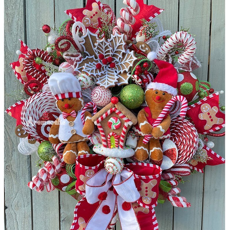 👋Handmade 📐Size:Approx 26" 💐 looks very beautiful on double doors and/or French doors. 💐 🎅Materials: Evergreen Base, Glitter Picks, Mesh, Designer Wired Ribbon, Christmas Ornaments, Plush Gingerbread Dolls