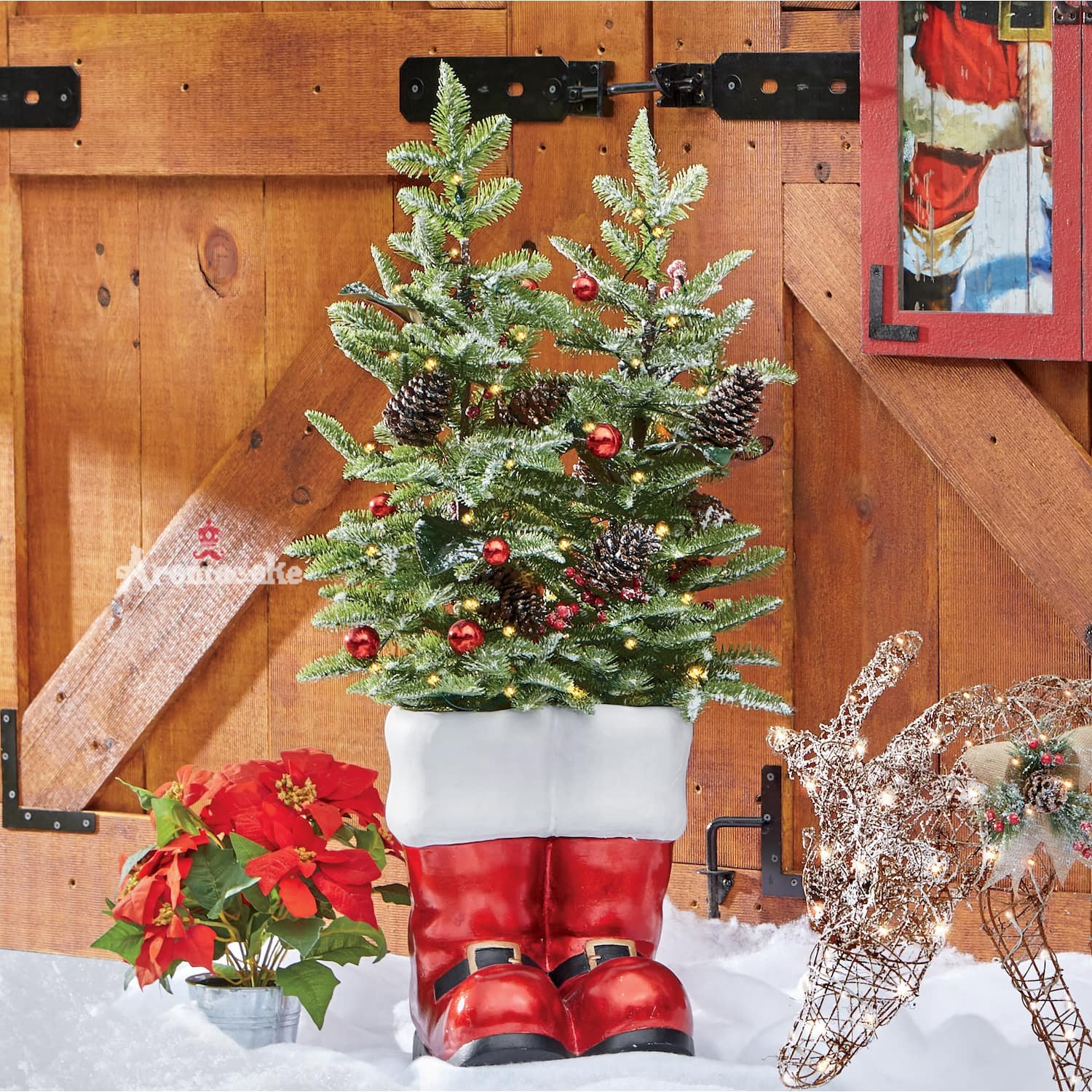 Eye-catching metallic boots create one-of-a-kind curb appeal. Filled with 2 "Christmas trees" adorned with red bulbs, pine cones, faux berries and 50 white lights.