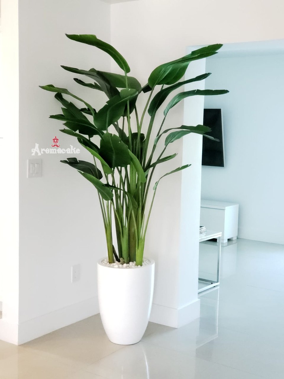 Ben planter in glossy white with 7 feet tall Bird of Paradise and white stones. The height and width of the plant can be manipulated due to its bendable nature.