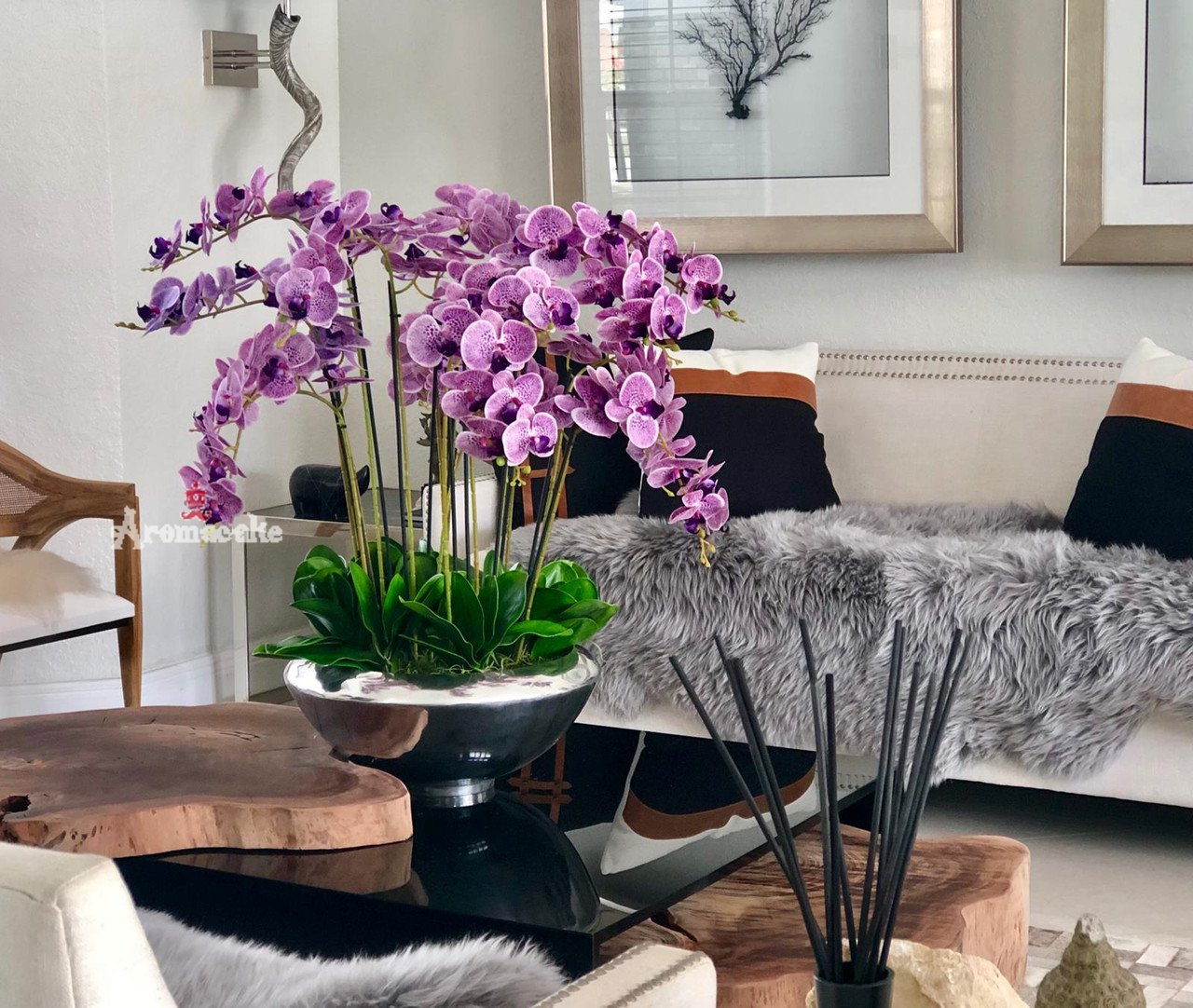 Graceful and exotic, the phalaenopsis orchid has symbolized integrity, nobility, and luxury for centuries. Our enduring, purple phalaenopsis arrangement captures the artistry and spirit of natural orchids. It’s prized for its profusion of perfect blooms. Vertical bamboo stakes, broad green leaves, and a genuine moss base add to the realism of this arrangement. Often called the “moth orchid,” the phalaenopsis is a favorite among our designers for its dense leaves, elegantly arching sprays and lovely blooms. Our remarkably lifelike arrangement is staked into a moss-covered silver avenue bowl for a timeless, authentic look that will endure for years to come. This arrangement is just the right size and is versatile enough to use as a coffee table centerpiece, a dining room or console table. It has a luscious tropical feel that will add vibrancy and elegance to any room.