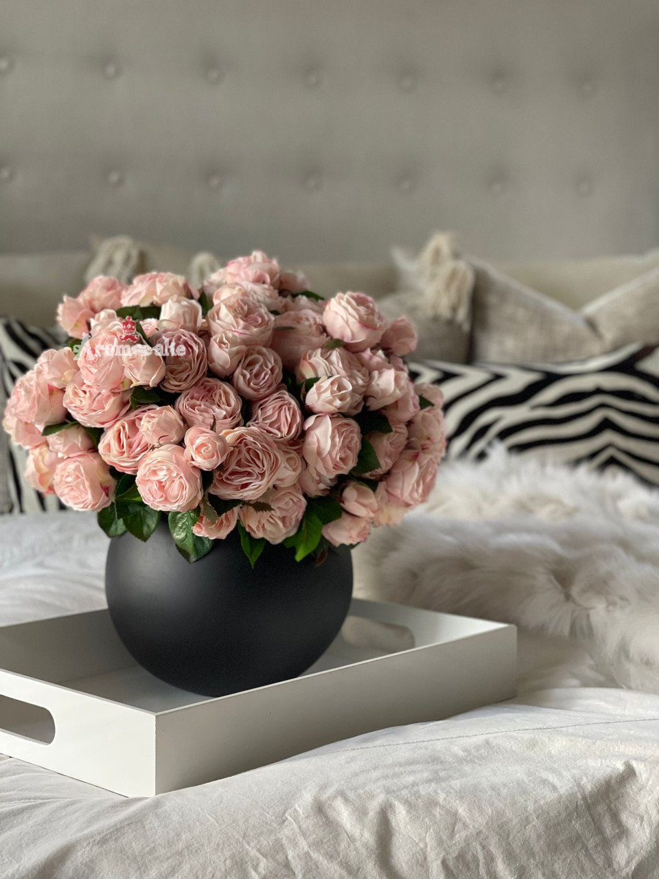 A bunch of blooming roses makes a stunning display. Blunt-cut stems are arranged in a matte black fishbowl vase for a classic touch of natural beauty. A mainstay of elegant bouquets and summer gardens, the rose is a flower with a rich history. It was first cultivated some 5,000 years ago, most likely in China, and it has come to represent many things. This arrangement captures the beauty and spirit of the world’s most universally loved flower; it features the real touch roses in different stages of bloom, known as a symbol of purity and innocence. This arrangement makes a stunning tabletop accent
