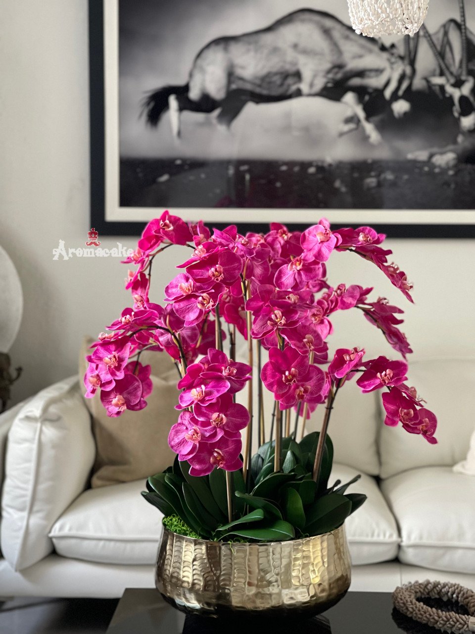 Graceful and exotic, the orchid has symbolized integrity, nobility, and luxury for centuries. Our enduring, bright pink phalaenopsis arrangement captures the artistry and spirit of natural orchids. It’s prized for its profusion of perfect blooms. Vertical bamboo stakes, broad green leaves, and a genuine moss base add to the realism of this arrangement. Often called the “moth orchid,” the phalaenopsis is a favorite among our designers for its dense leaves, elegantly arching sprays and lovely blooms. Our remarkably lifelike arrangement is staked into a moss-covered base in an elegant gold planter for a timeless, authentic look that will endure for years to come. This arrangement is just the right size and is versatile enough to use as a coffee table centerpiece, a dining room or console table. It has a luscious tropical feel that will add vibrancy, color and elegance to any room.