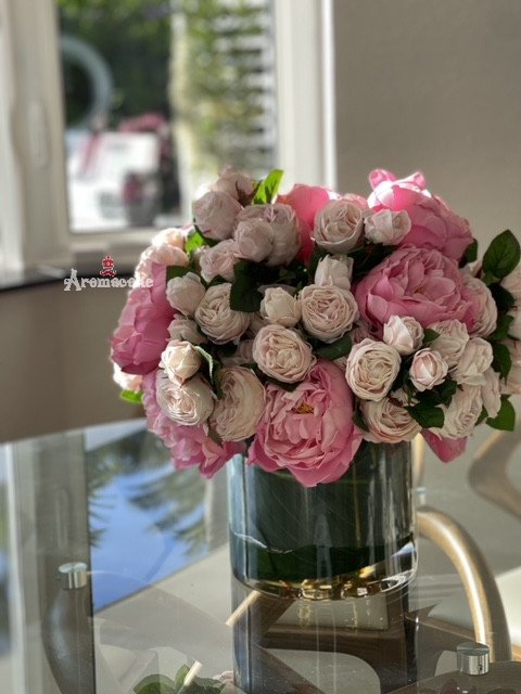 With dense, colorful blooms and contrasting dark green leaf in vase, this arrangement of peonies and roses is a showstopper in any garden. They flower in happy abandon. We think pinks are especially beautiful because their hues shift at different stages of bloom and in the changing light. The arrangement of exquisite bowl-shaped blossoms captures the peony’s natural beauty-including those intriguing nuances of color. Their stems are twirled together to form a gorgeous bouquet.