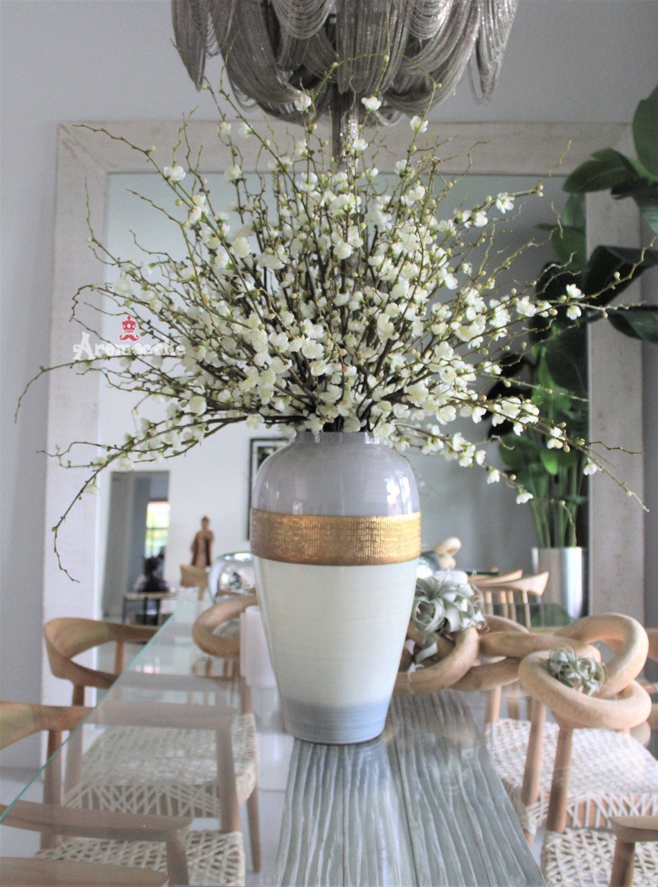 Faux flowers, real joy. Our gorgeous cherry blossoms, shown here in our gold ribbed goddess vase, have a level of detail that makes them hard to distinguish from the real thing, with staying power worthy of their timeless beauty. This large-scale cherry blossom flower arrangement makes a stunning dining table centerpiece; it also looks fabulous in an entryway or on a sofa or console table.