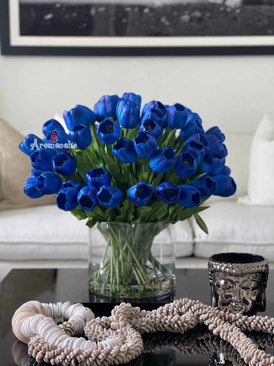 This arrangement features a bountiful bunch of blue tulips is simply breathtaking. Handcrafted and uncommonly lifelike, these blooms mixed with shapely leaves look as though they were just picked from a spring garden. This crisp and clean arrangement is set in a glass cylinder with acrylic “water,” adding to its realistic charm.