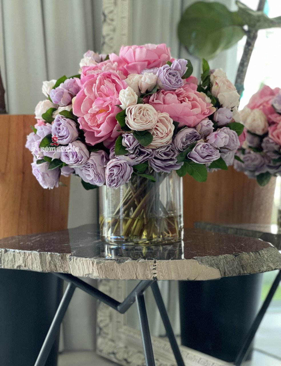 With dense, colorful blooms and contrasting dark green foliage, peonies and roses are showstoppers in any garden. They flower in happy abandon. We think pinks are especially beautiful because their hues shift at different stages of bloom and in the changing light. The arrangement of exquisite bowl-shaped blossoms captures the peony’s natural beauty-including those intriguing nuances of color. Their stems are twirled together to form a gorgeous bouquet.