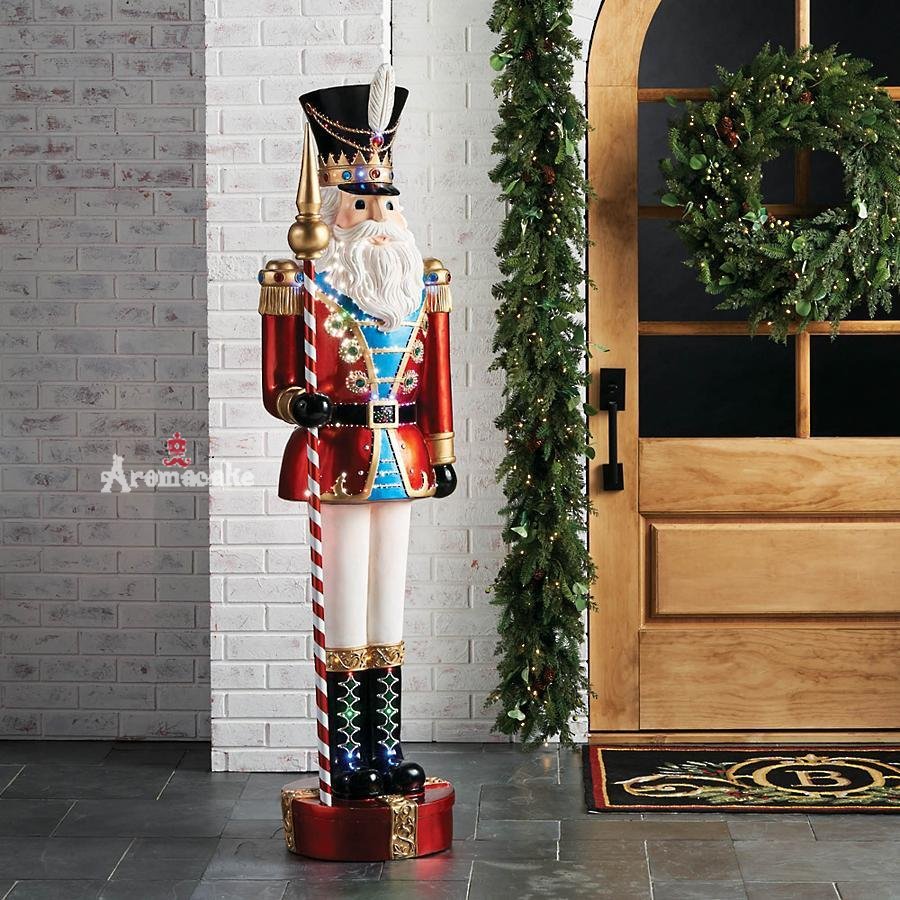 With full white beard, regal staff and a red, blue and gold uniform, this large-scale resin nutcracker brings holiday cheer with more than 500 multicolored lights. Yard stakes included for outdoor display, but this premium-quality decoration wows indoors or out.