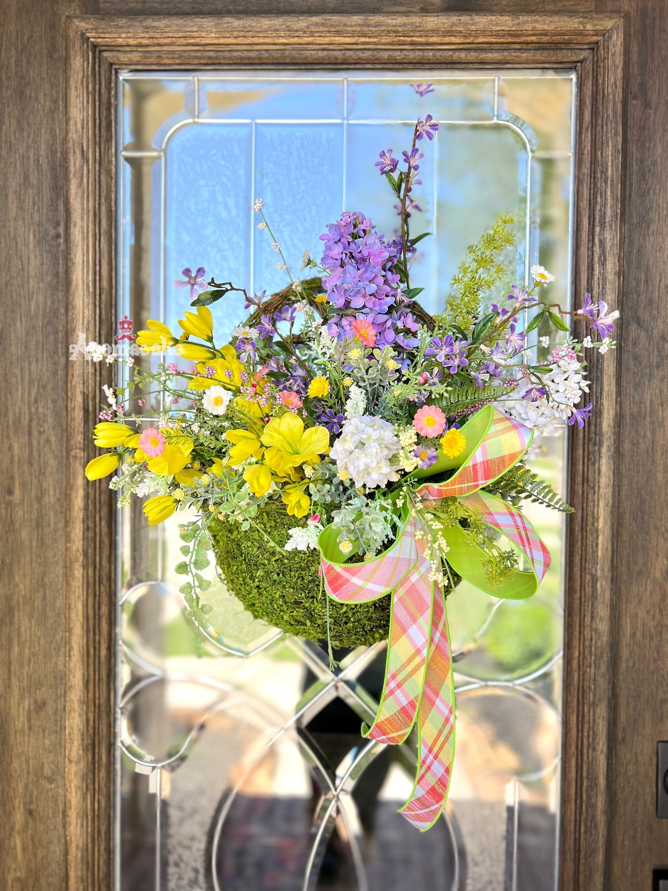 Welcome Spring to your home and to all who enter with a basket full of spring florals. All The must haves for spring florals are placed in perfect groupings to look fresh clipped and natural. This moss basket floral arrangement can be hung on your front door or indoors to add to your spring home decor. Perfect for Easter and Spring home decor.