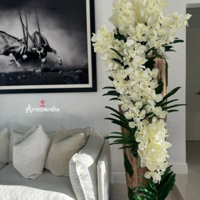 A naturally beautiful 20″ diameter x 60″ tall teak vase with a subtle natural finish paired with exotic white vanda orchids and leaves. This amazing one of a kind piece is truly a work of art. Designed with Mother Nature in mind, and mimicking their true appearance, these flowers are carefully placed throughout this textured live edge teak vase, beautifully displaying their natural hanging root systems.
