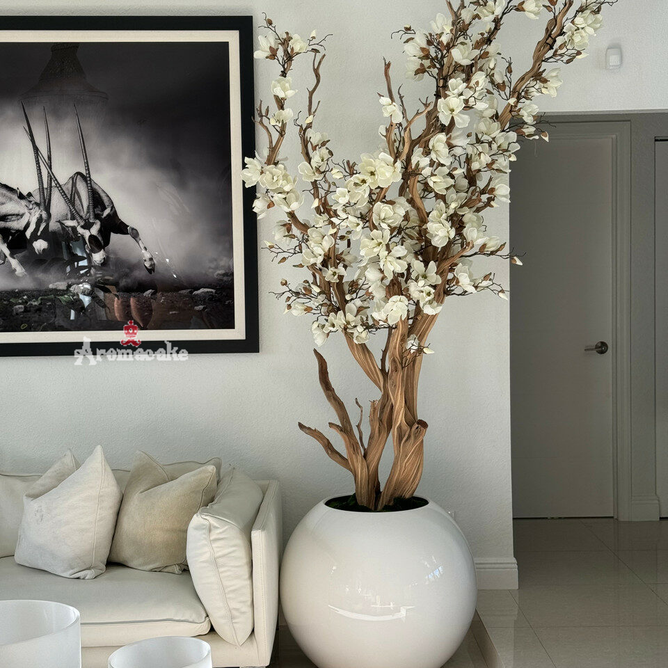 Enjoy beautiful, lifelike magnolia tree that won’t lose its flowers after spring awakens. Each tree is a one of a kind. Paired with our 30″ glossy white planter, this natural California tree’s flowers are placed by hand by our skilled artisans onto large wood trunks of California mountain wood. Displayed here in a real tree, magnolia flowers are cheerful and elegant in any season. Showcase this lovely faux tree in a foyer or corner of any room.