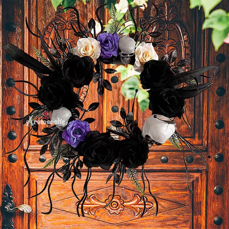 🎃SPECIAL DESIGN: This wreath is the perfect mix between spooky and chic. Manufactured with premium black, purple and champagne artificial roses, 3 skulls and black twigs, vivid and full of terror.