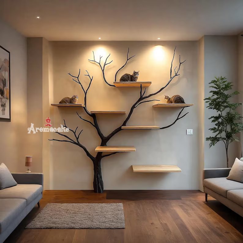 The tree-shaped wooden shelf in the picture is a creative interior product, handcrafted from solid wood by skilled craftsmen with many years of experience. The design is inspired by nature with wooden branches forming unique decorative shelves, both optimizing living space and enhancing the beauty of the house.