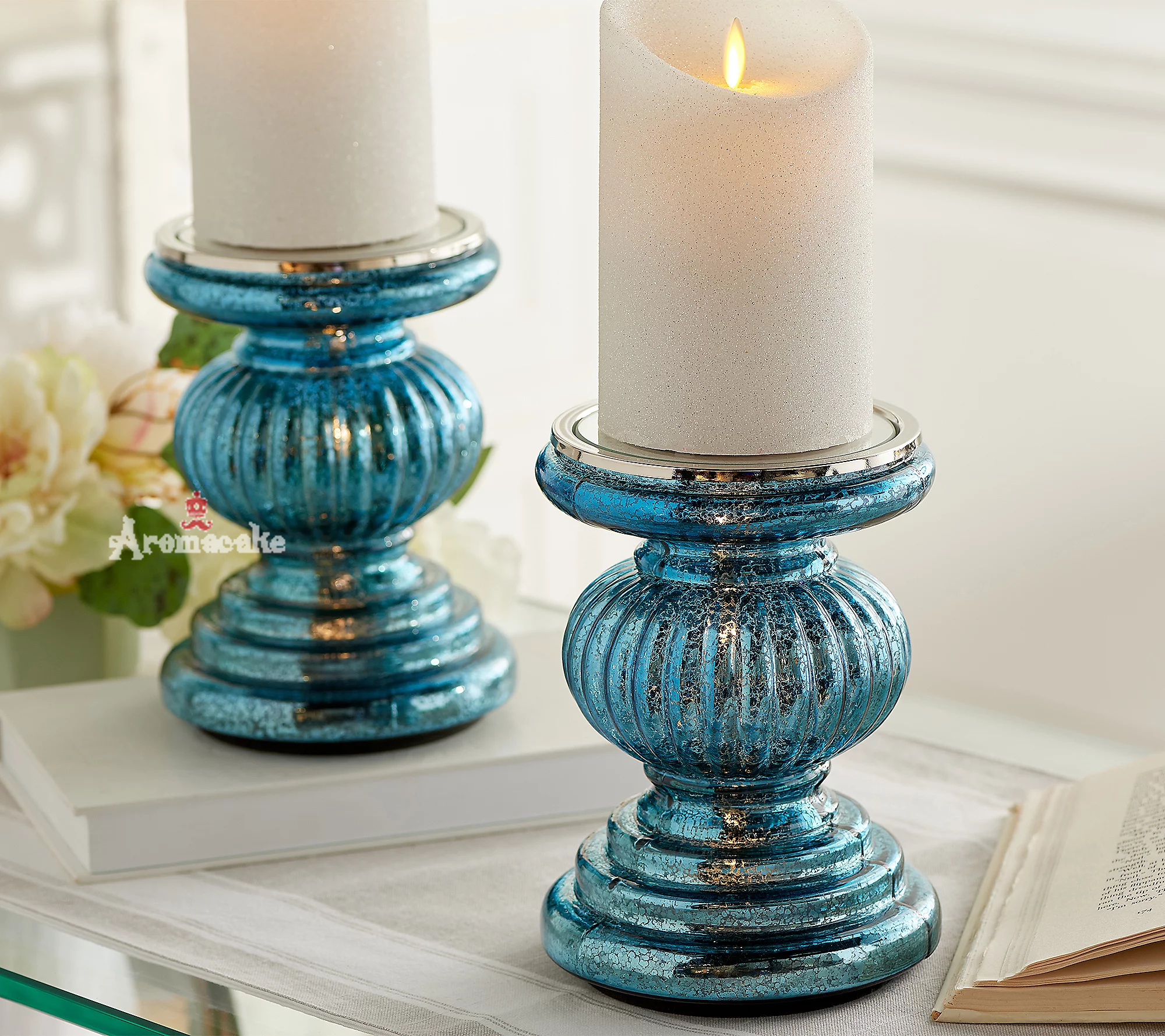 Set of 2 Lit Candle Holder Pedestals with Mirror Inserts