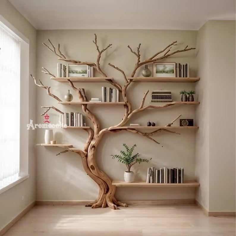 This natural wood bookshelf is designed by us to be very easy to install and has good load bearing capacity. We create beautiful, handmade shelves from natural tree branches, highlighting their unique shapes and textures. Our skilled artisans put their heart into every piece, making each shelf a unique work of art. Committed to sustainability and quality, we offer decor that is both useful and celebrates nature's beauty.