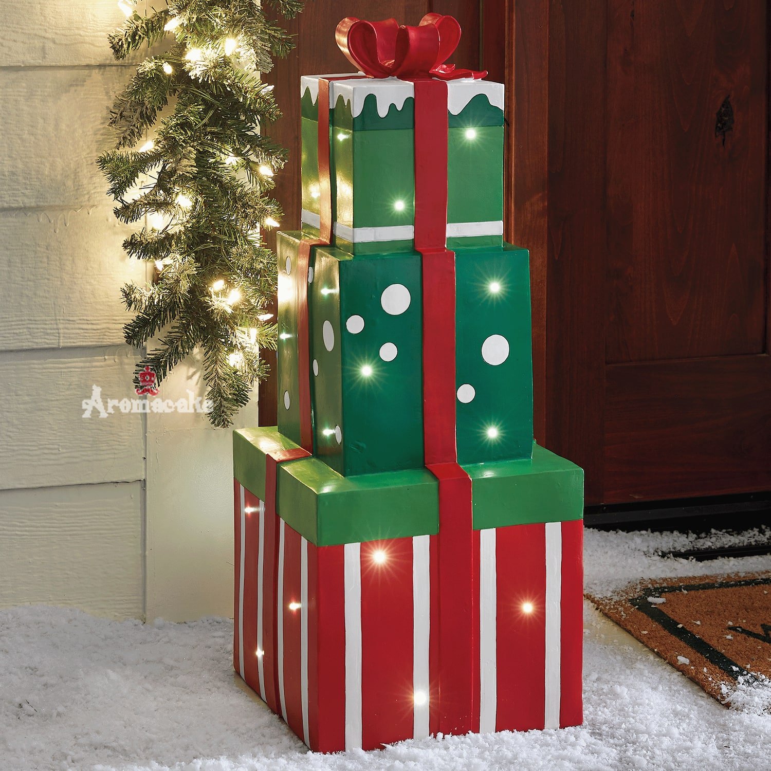 What Christmas magic is inside these whimsical gift boxes? Hand-painted polyresin “presents” are stacked and lit with warm white LEDs throughout.