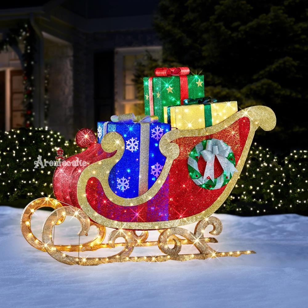 This beautiful lamp post shines and sparkles with 120 Warm LED lights, wrapped with glittery gold weather resistant fabric and bronze metal trims.