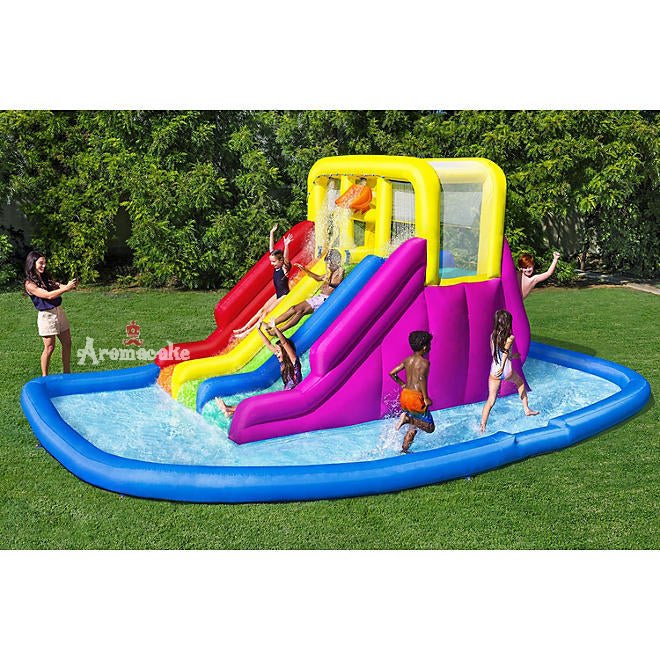 A huge inflatable pool surrounded by three slides,the Mega Water Park is the ultimate backyard accessory. This water park can host up to nine kids for a splash-filled day outdoors. Friends can race up the triple climbing wall, which features individual padded handles and footholds for safety. At the mesh tower peak, three different slides offer three fun ways to splash down, each with a unique adventure. Slide one is equipped with a water sprayer for showers of fun, slide two features a spontaneous dump bucket and slide three has a wall of water to venture through. Kids can take turns trying each slide as they race to the bottom for a huge splash in the pool for triple the summer fun.