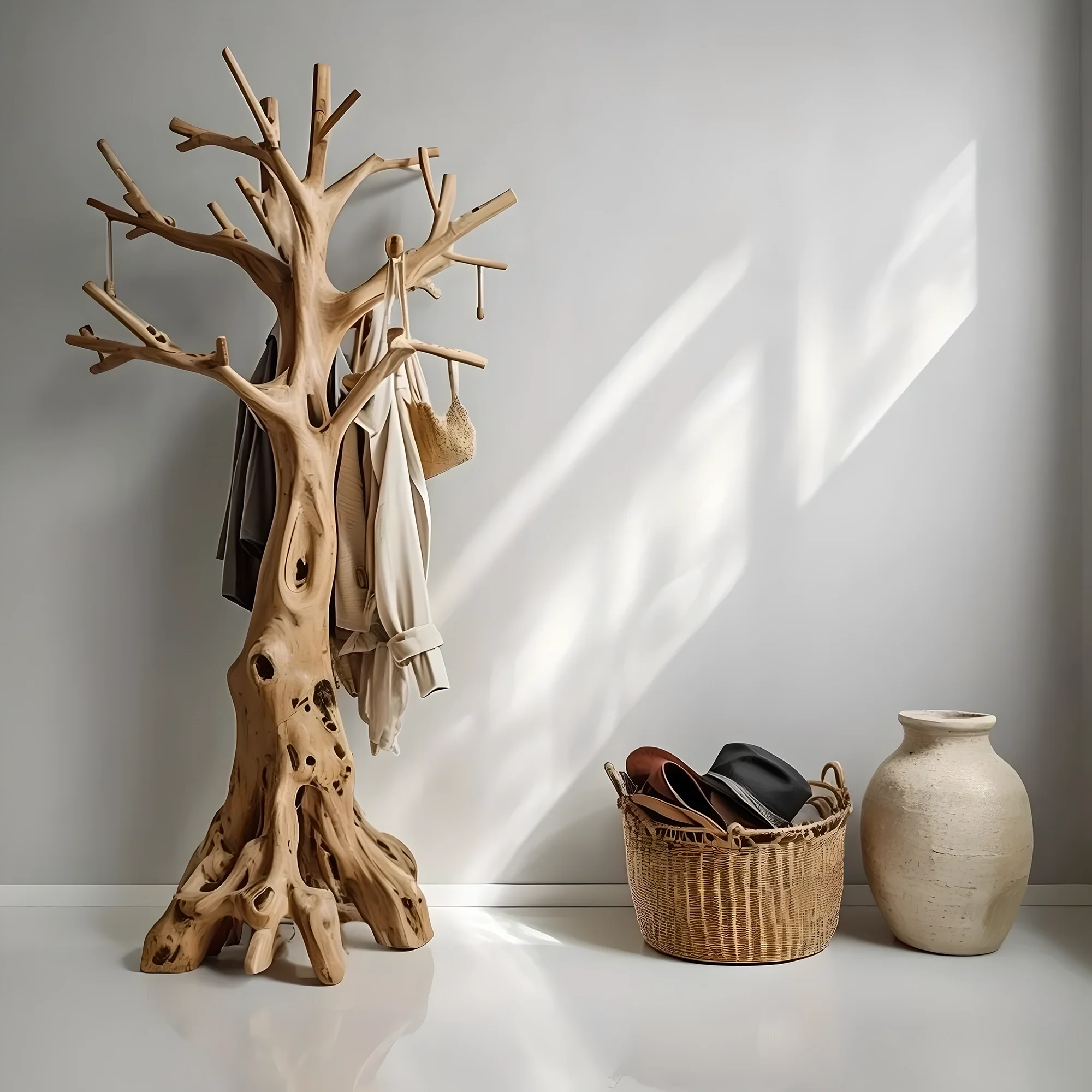 The tree-shaped coat rack made from driftwood is a unique handicraft product, highly aesthetic and close to nature. The process of making this type of shelf requires meticulousness and high technique to preserve the natural beauty of driftwood.
