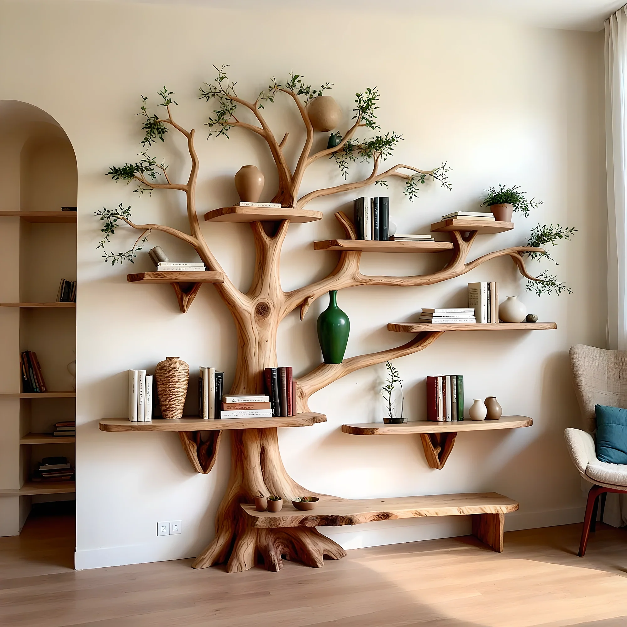 In addition to the function of storing books, the tree-shaped bookshelf is also a place where you can arrange decorations and personal items in a creative and aesthetic way. In particular, it is very suitable for small rooms, helping to optimize space and bring a feeling of relaxation.